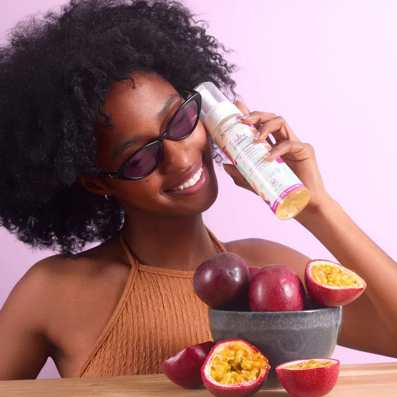 La mousse de maracuja Tendre Passion Activilong réveille les boucles avec légèreté. Sa texture aérienne hydrate sans alourdir et parfume délicatement les cheveux.