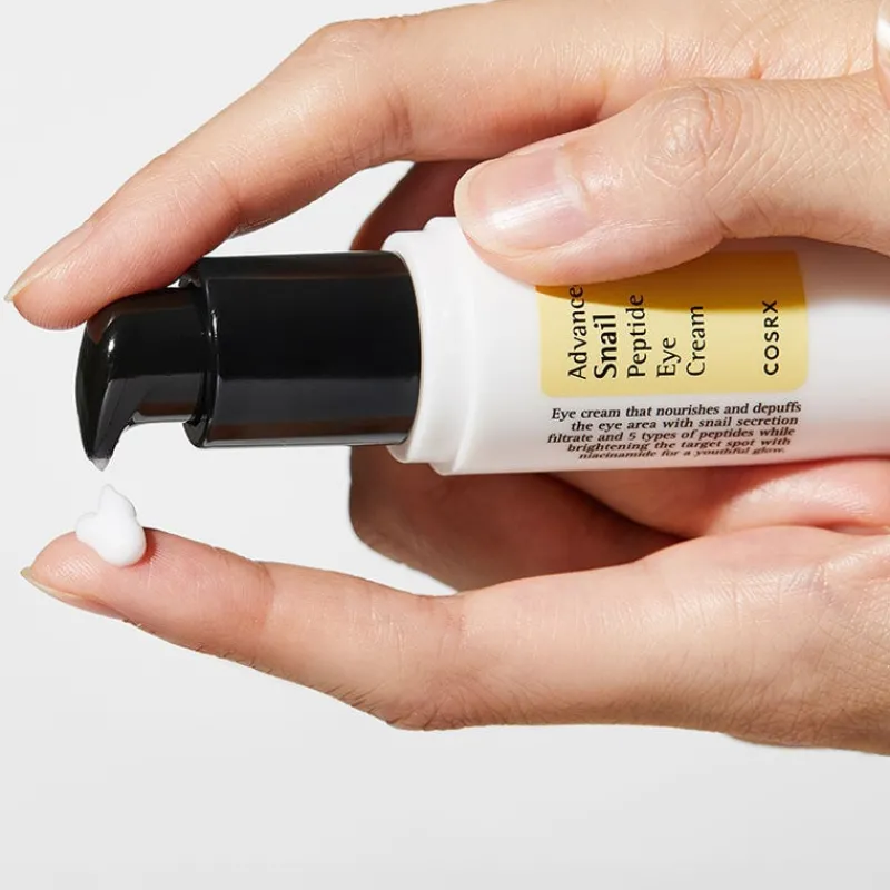 Après votre nettoyage, tonique, l’essence Advanced Snail 96, la crème hydratante tout-en-un sur l’ensemble du visage, tapotez doucement la crème de contour des yeux tout autour de l’œil.
