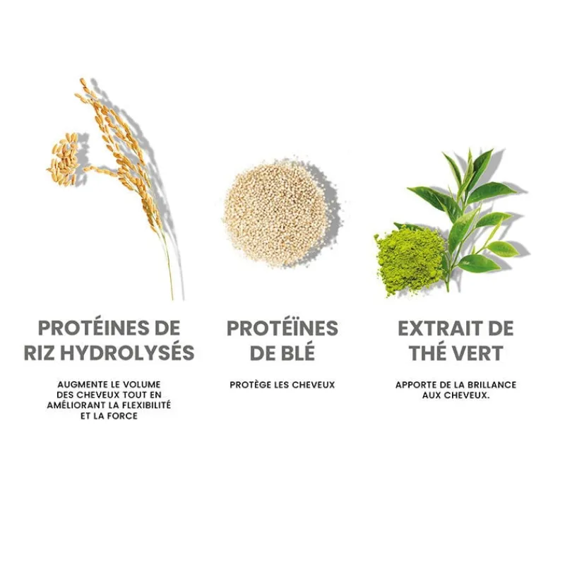 • Les protéines de riz et de soja hydrolysées augmente la souplesse et fortifie la fibre.