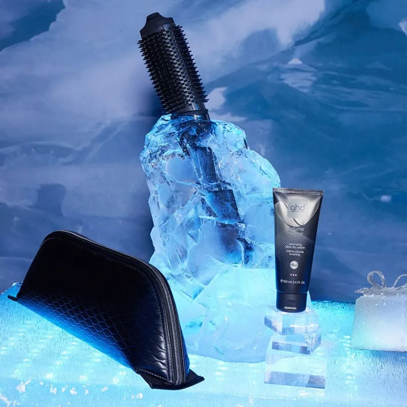 Pour les fêtes, craquez pour le coffret d’exception de ghd : une somptueuse pochette thermorésistante qui contient la brosse soufflante Duet Blowdry et la crème volume forever.