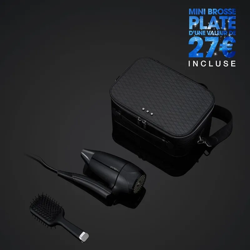 Le coffret d’Exception sèche cheveux flight+ Ghd comprends le sèche-cheveux de voyage ultra compact et pliable, son vanity de transport et la mini brosse démêlante !
