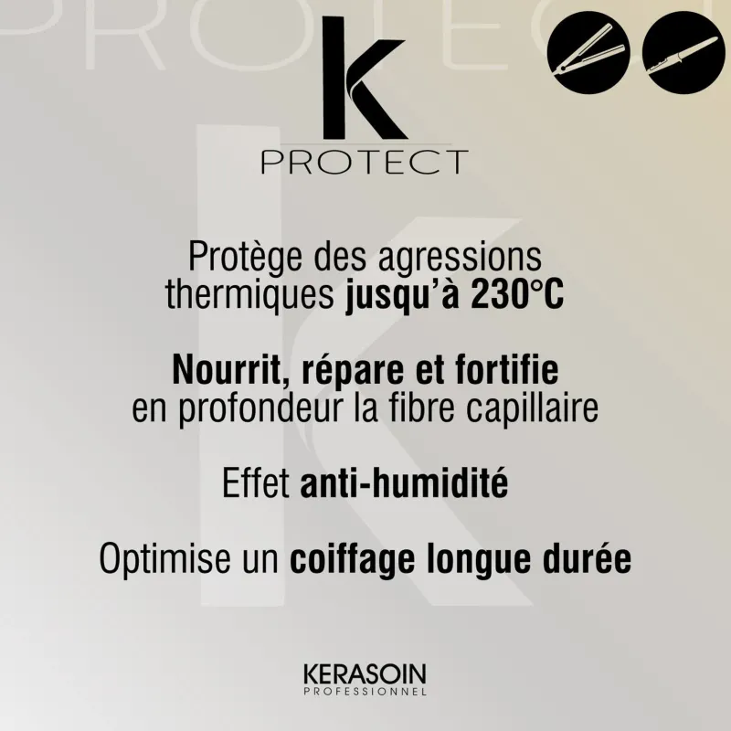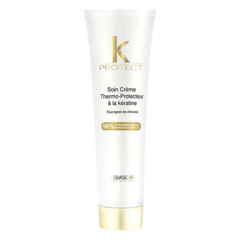 La crème thermo-protectrice à la kératine K Protect de Kerasoin Professionnel nourrit, répare et fortifie en profondeur la fibre capillaire.