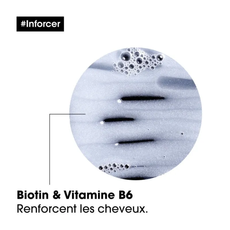 Le shampooing anti-casse Inforcer Serie Expert de L’Oréal Professionnel Paris lave en douceur les cheveux secs et abîmés ou cassants et les laisse doux et souples. Sa mousse légère et généreuse lave efficacement et élimine les impuretés, laissant les cheveux propres et légers. Cette formule professionnelle est enrichie en Vitamine B6 et en Biotine.