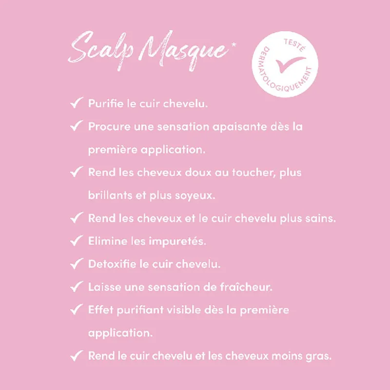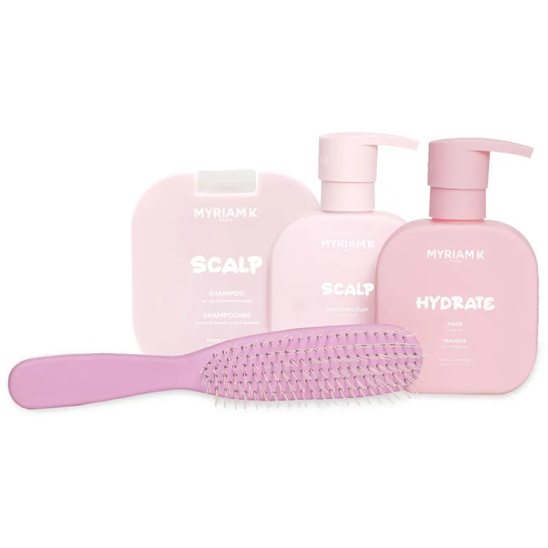Ce programme se compose de trois soins complémentaires : Purifying Clay Scalp, Scalp Shampoo, Hydrate Mask et la brosse Scalp Brush Pink.