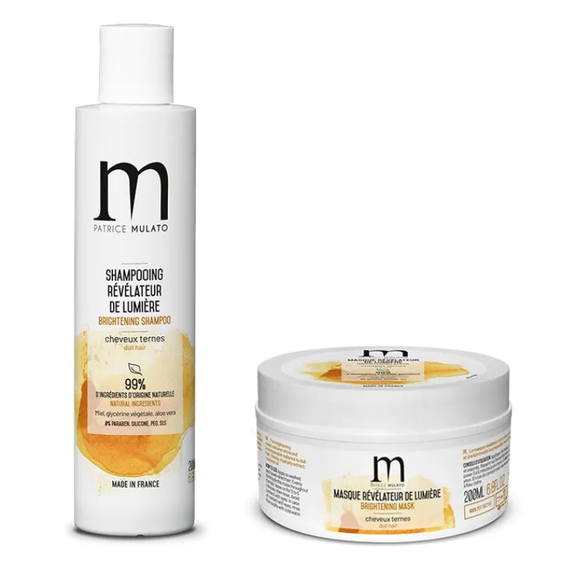 Révélez la brillance avec le Duo révélateur de lumière, il est composé du shampooing et du masque révélateurs de lumière à la compo green et fabriqués en France de Patrice Mulato !