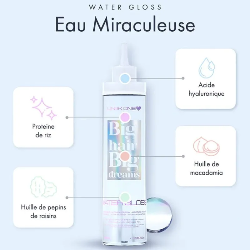 Riche en protéines et acides aminés, l’eau lamellaire miraculeuse Water Gloss de Uniikon réhydrate la chevelure pour longtemps ! Elle laisse les cheveux gainés, souple et brillants !