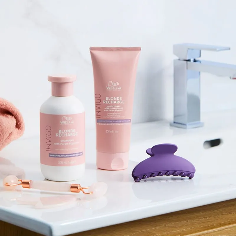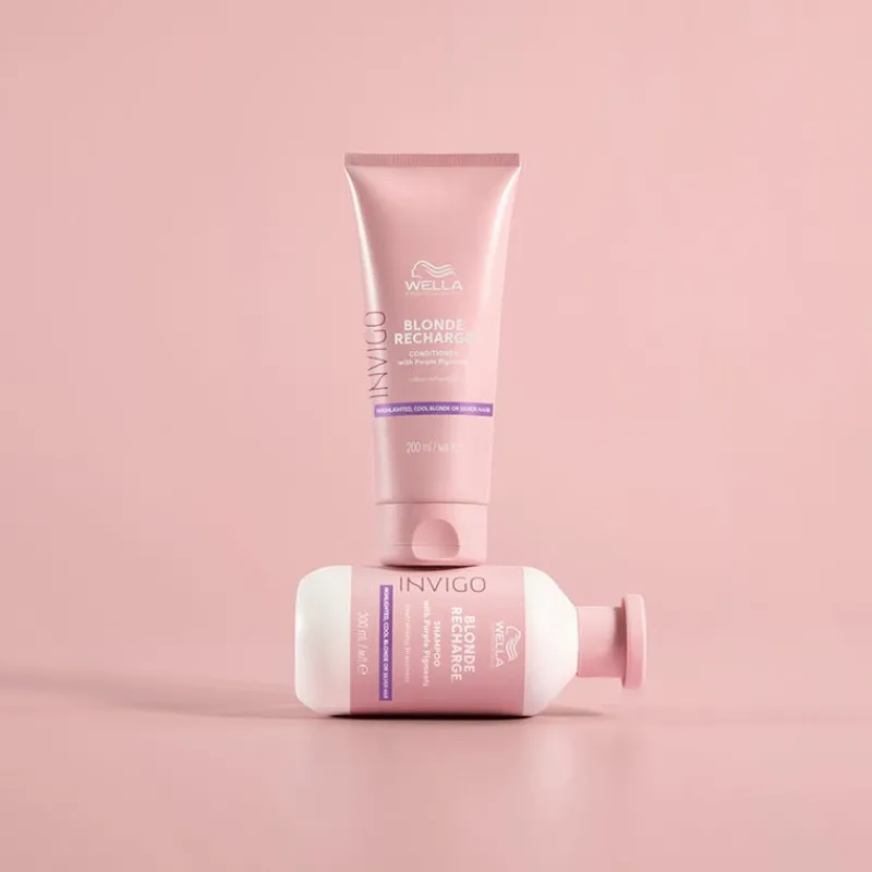 Conservez un blond éclatant avec le shampooing raviveur de couleur blond froid Invigo Blonde Recharge Wella Professionals.