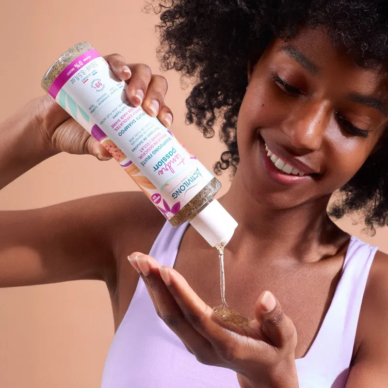 Le shampooing fruité Tendre Passion Activilong réveille la brillance des cheveux texturés en douceur, avec une touche acidulée.