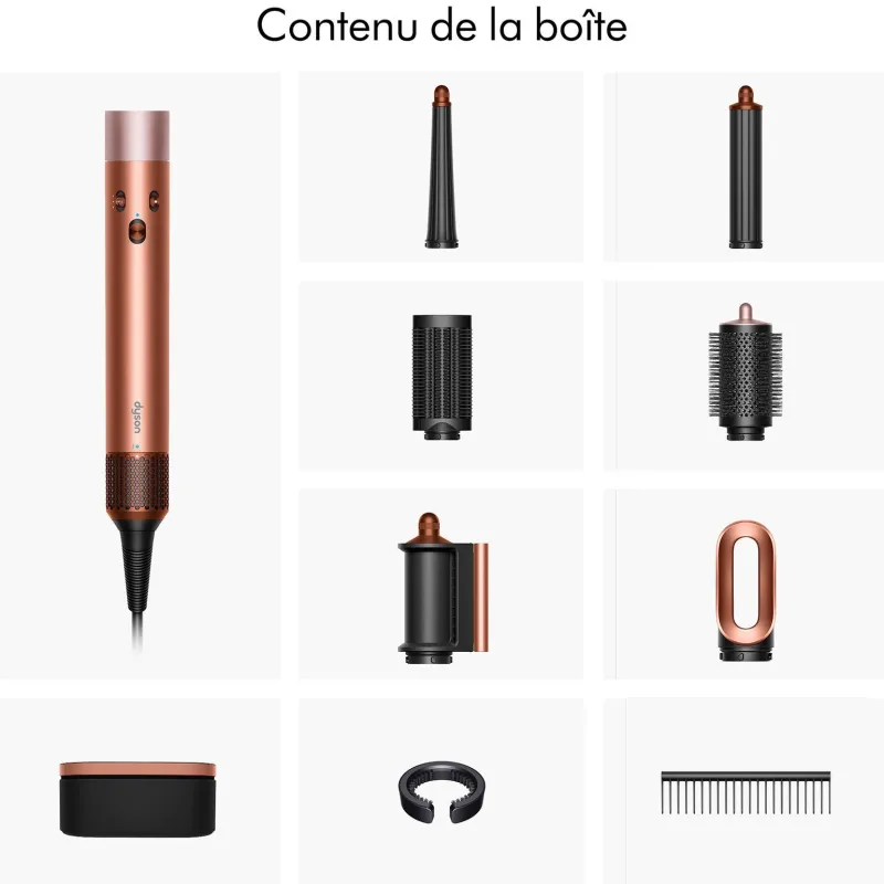 • Inclus : rouleaux, embouts Dyson, accessoires coiffage et coffret de présentation.