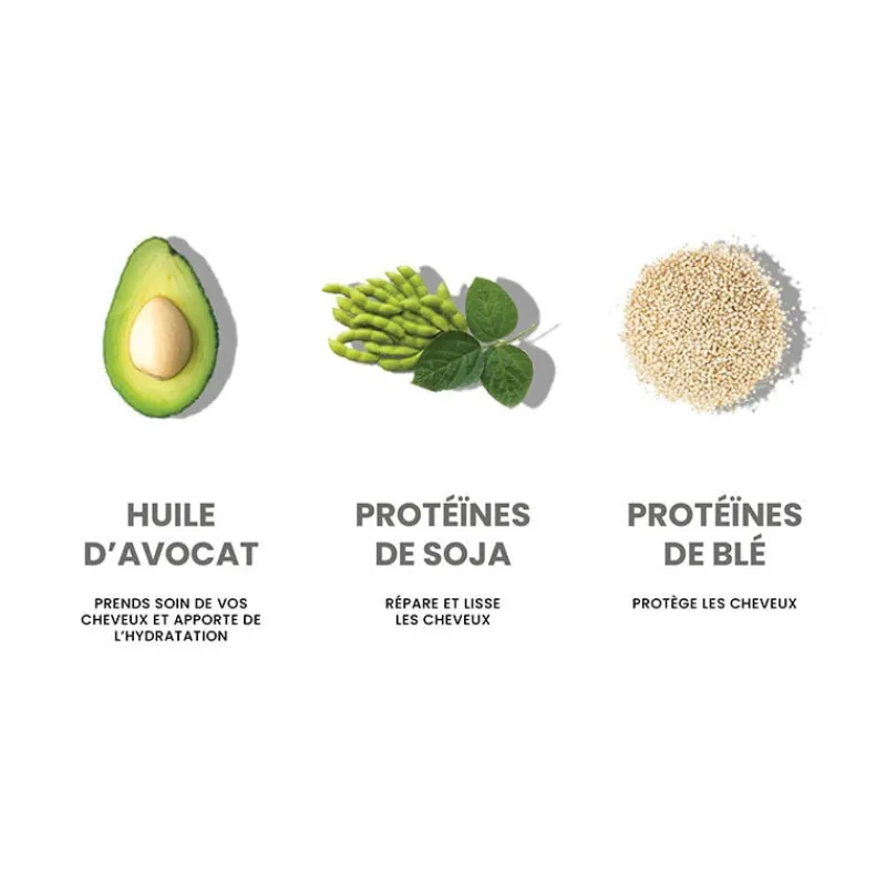 • Les protéines de soja hydrolysées réparent les cheveux sensibilisés et aide au lissage.