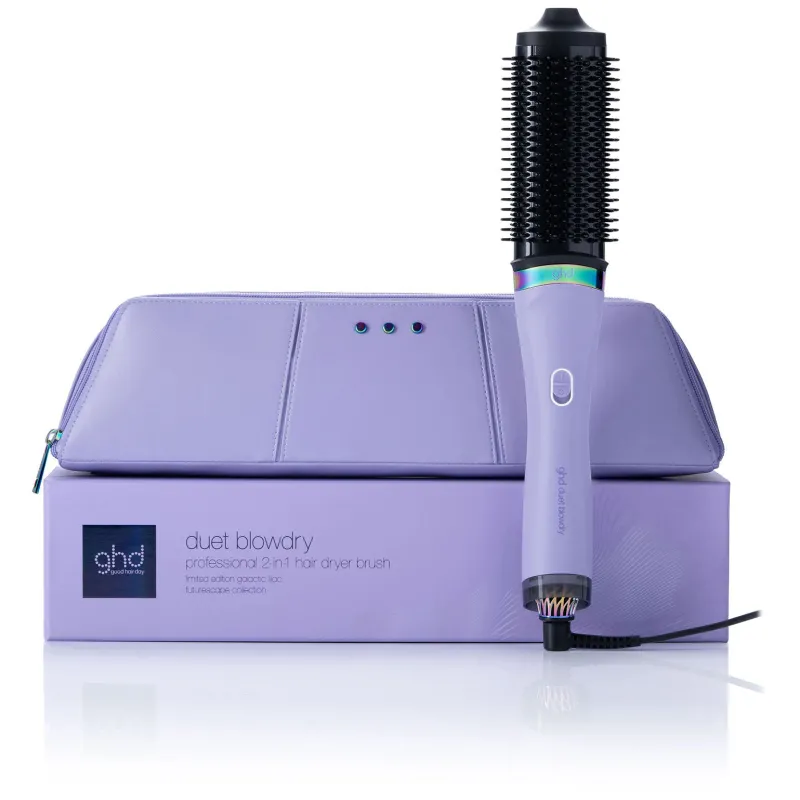 La brosse soufflante 2-en-1 Duet Blowdry de Ghd est disponible dans un coloris violet galactique aux nuances irisées pour l’édition limitée Collection Futurescape !