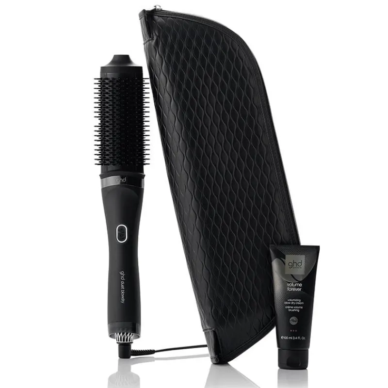Pour les fêtes, craquez pour le coffret d’exception de ghd : une somptueuse pochette thermorésistante qui contient la brosse soufflante Duet Blowdry et la crème volume forever.