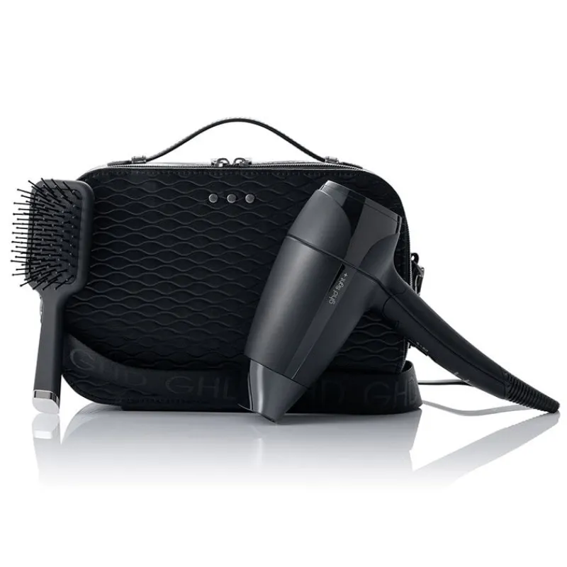 Le coffret d’Exception sèche cheveux flight+ Ghd comprends le sèche-cheveux de voyage ultra compact et pliable, son vanity de transport et la mini brosse démêlante !