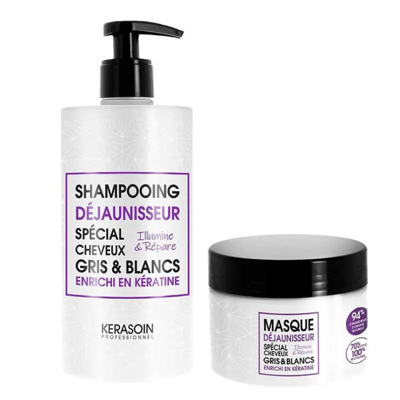 Déjaunissez vos cheveux poivre et sel avec le Rituel cheveux gris et blancs disponible à La Boutique du Coiffeur. Il comprend le shampooing et le masque déjaunisseurs Kerasoin.