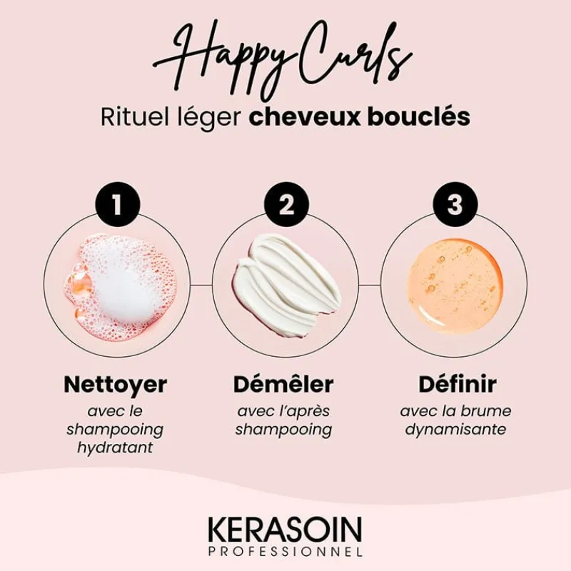 Le rituel léger cheveux bouclés Happy Curls de Kerasoin Professionnel est votre routine de soin pour des boucles légères, douces, hydratées et toniques !