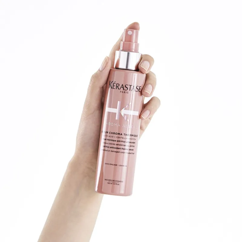 Pour des cheveux colorés en pleine santé, protégez votre chevelure des agressions extérieures, de la chaleur et des UV avec le sérum anti-frizz Chroma Thermique de Kérastase !