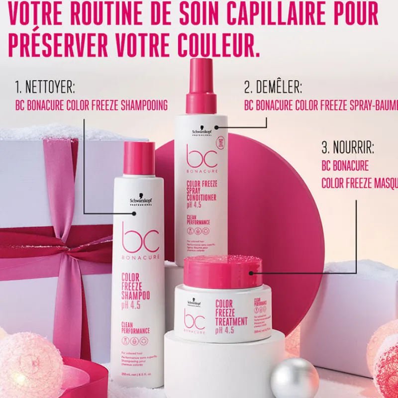 Craquez pour le rituel Bonacure Color Freeze, disponible à La Boutique du Coiffeur. Cette trousse contient les trois essentiels pour des cheveux colorés doux et protégés !